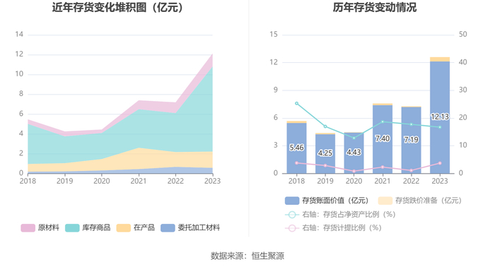 从存货变动来看,截至2023年年末,公司存货账面价值为12.13亿元,占净资产的16.72%,较上年末增加4.94亿元。其中,存货跌价准备为4700.39万元,计提比例为3.73%。