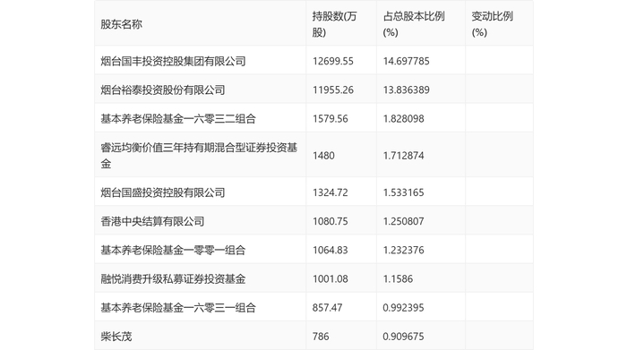 年报显示,2023年年末公司十大流通股东中,新进股东为柴长茂,取代了三季度末的融悦百纳创新驱动私募证券投资基金。在具体持股比例上,烟台国丰投资控股集团有限公司、基本养老保险基金一零零一组合持股有所上升,睿远均衡价值三年持有期混合型证券投资基金、香港中央结算有限公司持股有所下降。