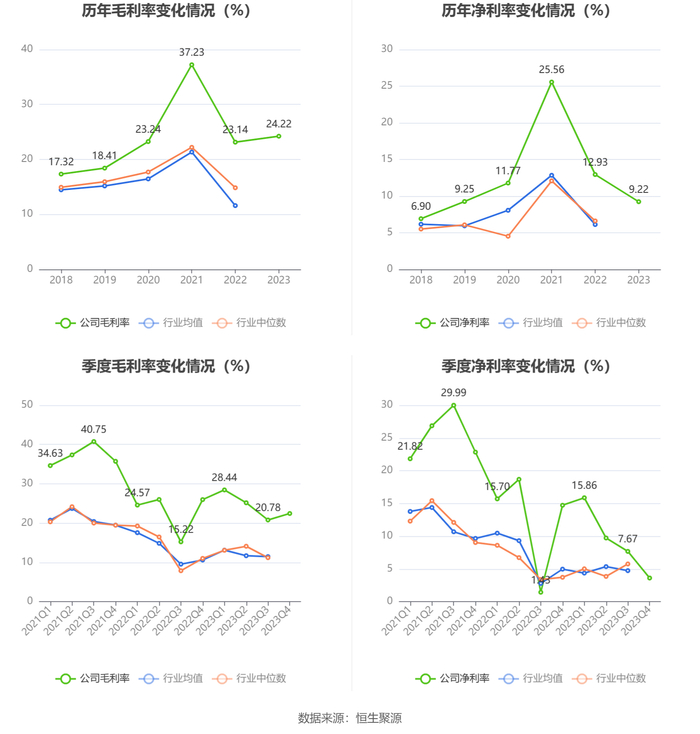 2023年,公司毛利率为24.22%,同比上升1.08个百分点;净利率为9.22%,较上年同期下降3.71个百分点。从单季度指标来看,2023年第四季度公司毛利率为22.44%,同比下降3.53个百分点,环比上升1.66个百分点;净利率为3.61%,较上年同期下降11.11个百分点,较上一季度下降4.06个百分点。