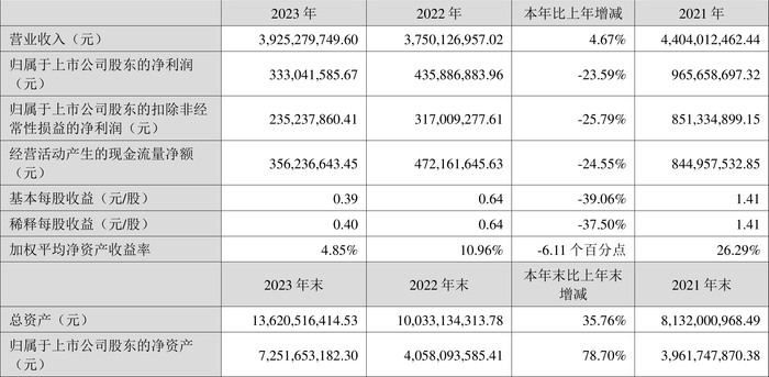 中证智能财讯 泰和新材(002254)4月29日披露2023年年度报告。2023年,公司实现营业收入39.25亿元,同比增长4.67%;归母净利润3.33亿元,同比下降23.59%;经营活动产生的现金流量净额为3.56亿元,同比下降24.55%;报告期内,泰和新材加权平均净资产收益率为4.85%,基本每股收益为0.39元。公司2023年年度利润分配预案为:拟向全体股东每10股派3元(含税)。