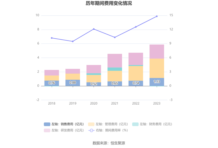 2023年,公司期间费用为5.82亿元,较上年同期增加1.11亿元;期间费用率为14.82%,较上年同期上升2.26个百分点。其中,销售费用同比增长53.3%,管理费用同比增长31.33%,研发费用同比增长14.35%,财务费用由去年同期的1380.96万元变为-527.52万元。