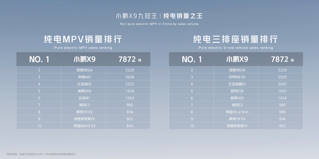 作为首款打破MPV界限的大七座车型,小鹏X9凭借着从产品设计到智驾科技的全面创新,实力获封“九冠王”称号。它不仅打破了传统MPV千篇一律的方盒子造型,将大七座MPV、大四座SUV合二为一,开创出超智能大七座家庭用车新品类,成为名副其实的品类创新之王。同时,小鹏X9还是市场公认的销量之王,2024年1月-3月累计交付7872台,稳居纯电MPV销量冠军以及纯电三排座销量冠军的宝座。