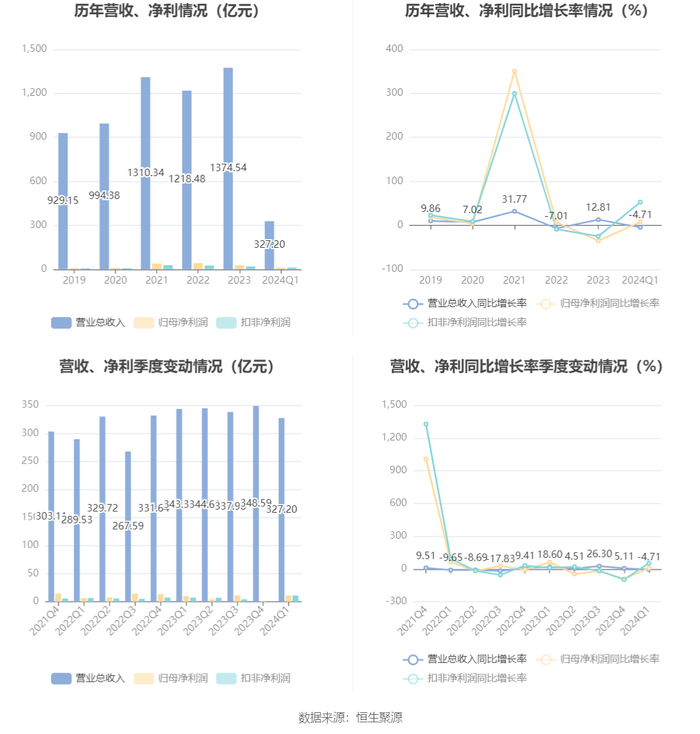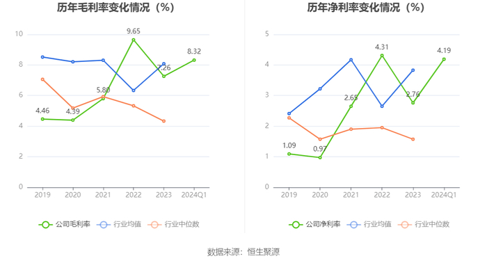 2024年第一季度,公司毛利率为8.32%,同比上升0.39个百分点;净利率为4.19%,较上年同期上升0.56个百分点。