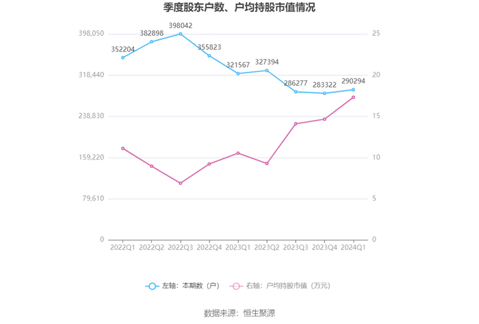 筹码集中度方面,截至2024年一季度末,公司股东总户数为29.03万户,较上年末增长了6972户,增幅2.46%;户均持股市值由上年末的14.66万元上升至17.32万元,增幅为18.14%。