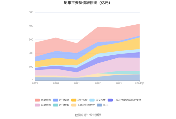 负债重大变化方面,截至2024年一季度末,公司应付账款较上年末增加41.22%,占公司总资产比重上升2.60个百分点;一年内到期的非流动负债较上年末增加60.96%,占公司总资产比重上升1.68个百分点;短期借款较上年末减少10.20%,占公司总资产比重下降1.85个百分点;长期应付款合计较上年末减少44.10%,占公司总资产比重下降0.32个百分点。