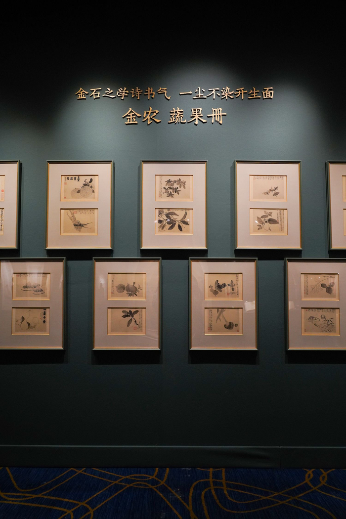 “扬州八怪”之首金农《蔬果册》十六开也是本次展览中的亮点,册页皆以水墨绘果蔬十六种,古貌新体,一尘不染。无论构图、笔墨、审美情趣,均体现出金农绘画艺术的独特之处。每页或题小诗,或著数语,风趣横生,书法亦瘦劲,书卷之趣浥人心目。此《蔬果册》作于1756年,正值金农七十岁之际,也是其创作此类杂画册技法和风格最为成熟阶段。是册民国时有《金冬心花果妙品(西湖伊兰题)》珂罗版单行本刊行。另上海博物馆编纂《中国书画家印鉴款识·金农》第8印即取自本册。