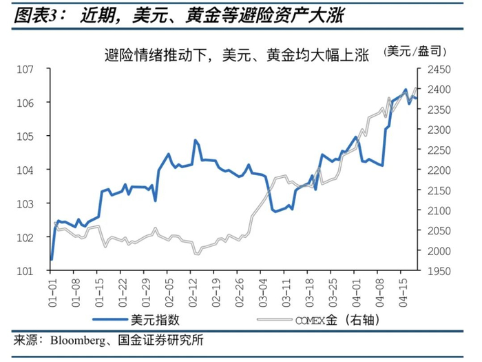 此外,地缘政治等因素则加剧了近期新兴市场的风险。随着以色列与巴勒斯坦、伊朗等方面的摩擦愈演愈烈,中东紧张的地缘局势对全球投资者的风险偏好也产生了明显影响。4月8日以来,标普500隐含波动率(VIX)与美国债市隐含波动率(MOVE)指数分别上涨23.2%、12%至18.7点、111.3点。避险情绪的明显升温,既推升了黄金等避险资产的价格,也加速了资金从新兴市场的外流,加剧了新兴市场的风险。