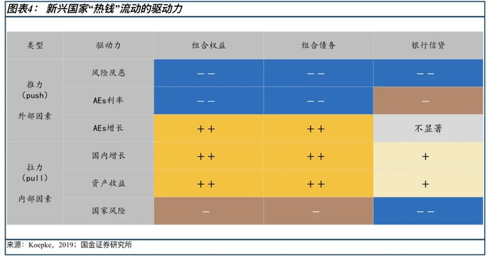 新兴市场热钱流动的驱动因素可分为三类:推力(push)、拉力(pull)和渠道(pipe)。