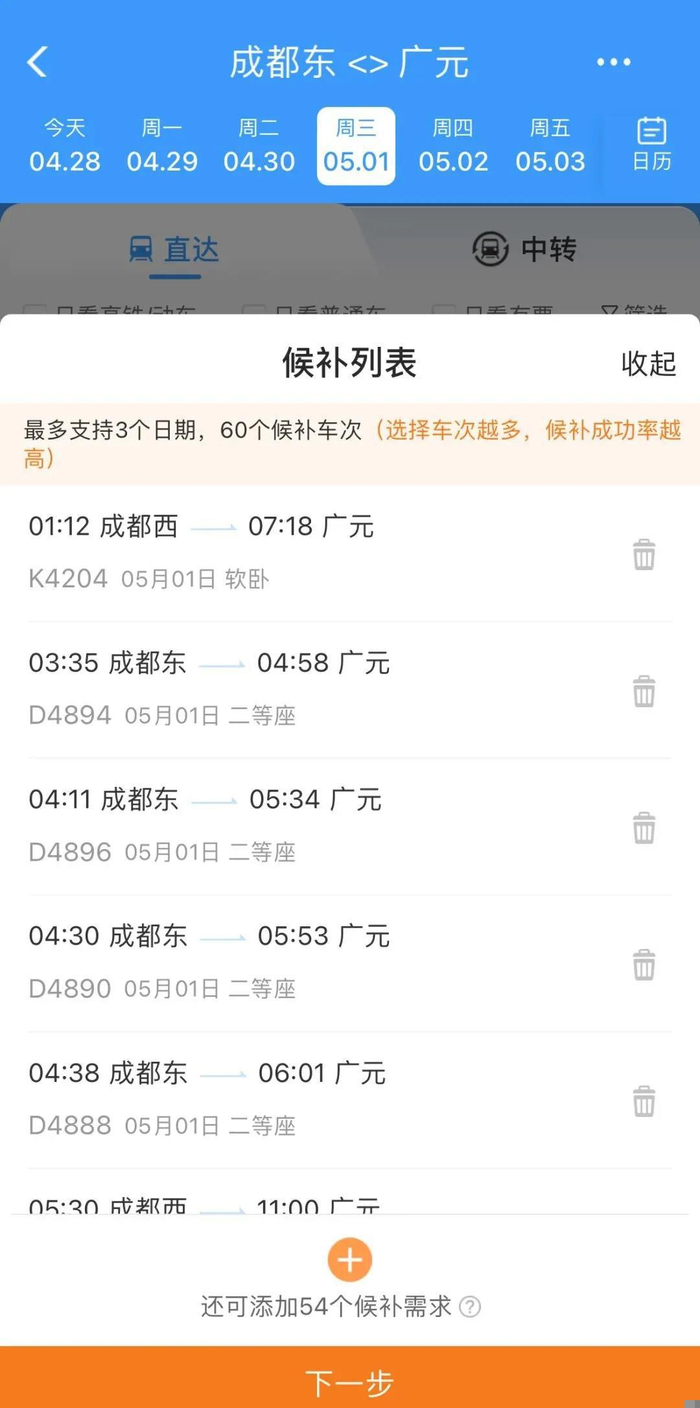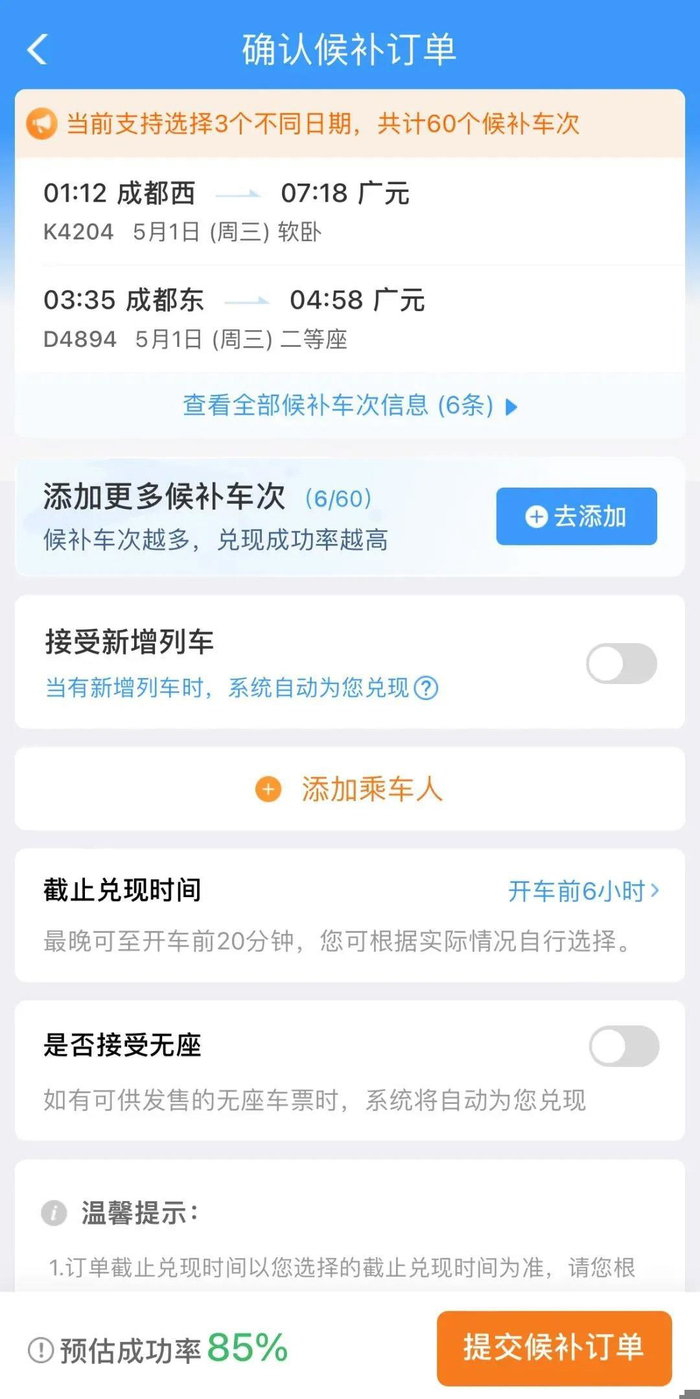 旅客候补车次越多,兑现成功率越高。待兑现的候补订单数量最多可为6个,每个订单最多可添加9名乘车人,可选择任意3个乘车日期,最多可选择60个车次。候补订单截止兑现时间为开车前20分钟,可选择接受符合出行需求的新增旅客列车车票。