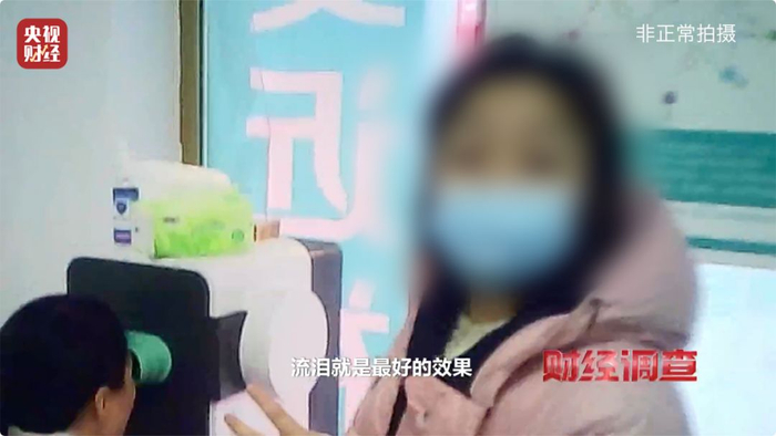 记者在体验这台设备时,被要求用目光跟随仪器内部中的字母和红点的轨迹,或远或近,或转圈或平移。工作人员反复叮嘱记者,在长达九分钟左右的体验过程中,千万不能眨眼,只要眨眼,就没有任何治疗效果。记者强忍着不适,坚持没有眨眼,完成了体验,泪水横流,眼睛酸胀疼痛,工作人员却称,这样就算是达到了治疗效果。