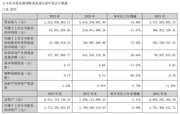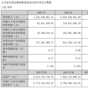 挖贝网4月28日,利民股份 近日发布2023年度报告,报告期内公司实现营业收入4,223,936,964.12元,同比减少15.80%;归属于上市公司股东的净利润62,051,829.92元,同比减少71.67%。