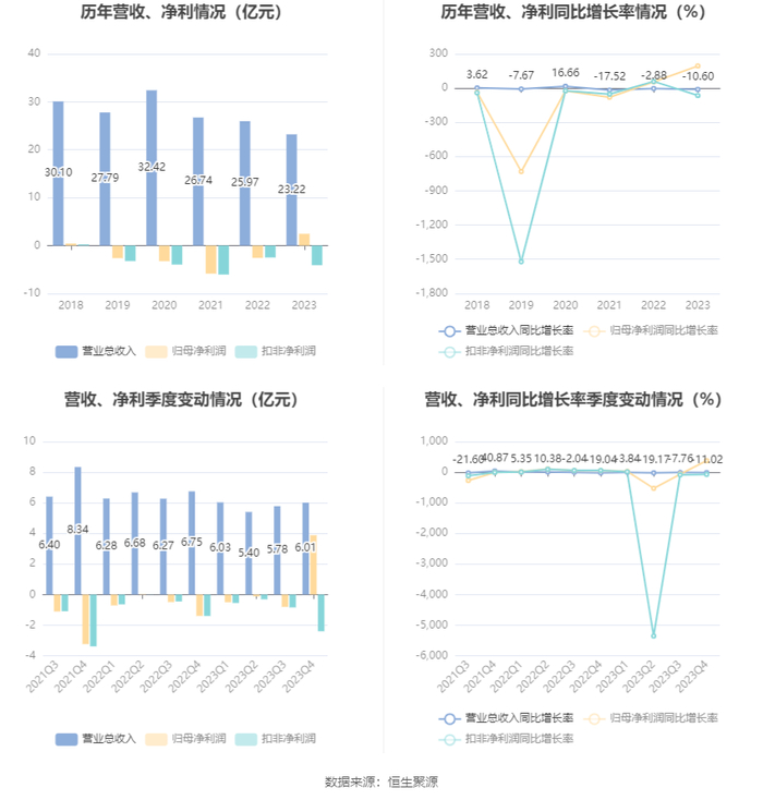 中证智能财讯 银宝山新(002786)4月29日披露2023年年报。2023年,公司实现营业总收入23.22亿元,同比下降10.60%;归母净利润2.45亿元,同比扭亏;扣非净利润亏损4.10亿元,上年同期亏损2.49亿元;经营活动产生的现金流量净额为1.07亿元,同比增长104.22%;报告期内,银宝山新基本每股收益为0.49元,加权平均净资产收益率为67.32%。
