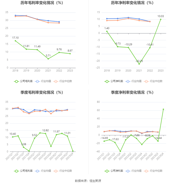 2023年,公司毛利率为8.97%,同比下降0.79个百分点;净利率为10.03%,较上年同期上升20.44个百分点。从单季度指标来看,2023年第四季度公司毛利率为0.46%,同比下降3.23个百分点,环比下降10.55个百分点;净利率为62.74%,较上年同期上升85.47个百分点,较上一季度上升77.18个百分点。