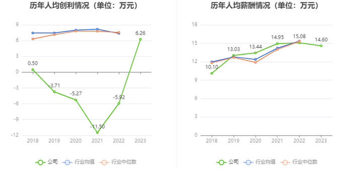 截至2023年末,公司员工总数为3908人,人均创收59.41万元,人均创利6.26万元,人均薪酬14.60万元,较上年同期分别变化-0.41%、205.79%、-3.22%。