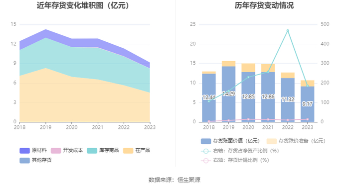 从存货变动来看,截至2023年年末,公司存货账面价值为9.17亿元,占净资产的185.81%,较上年末减少2.15亿元。其中,存货跌价准备为1.55亿元,计提比例为14.47%。