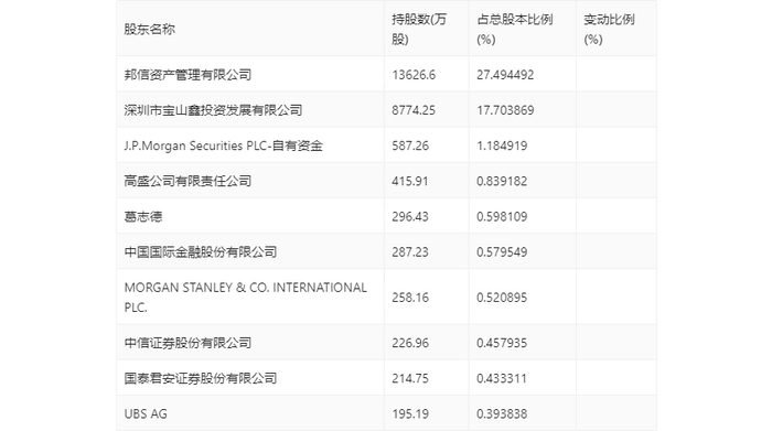 年报显示,2023年年末公司十大流通股东中,新进股东为J.P.Morgan Securities PLC-自有资金、高盛公司有限责任公司、中国国际金融股份有限公司、MORGAN STANLEY & CO. INTERNATIONAL PLC.、中信证券股份有限公司、国泰君安证券股份有限公司、UBS AG,取代了三季度末的光大证券股份有限公司、龚丽梅、张立言、文军太、于雪、邵春洁、欧伟。在具体持股比例上,葛志德持股有所上升。