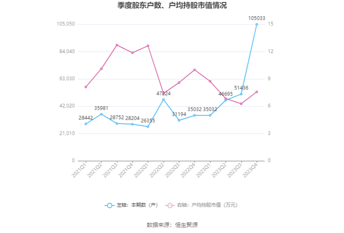 筹码集中度方面,截至2023年年末,公司股东总户数为10.5万户,较三季度末增长了5.36万户,增幅104.20%;户均持股市值由三季度末的6.28万元上升至7.58万元,增幅为20.70%。