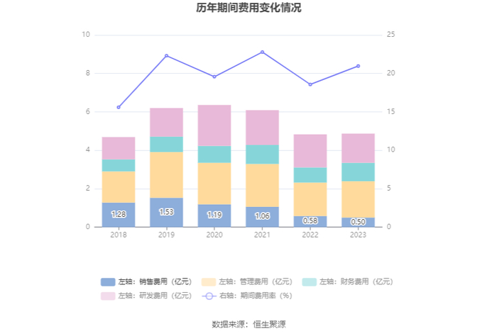 2023年,公司期间费用为4.87亿元,较上年同期增加467.93万元;期间费用率为20.97%,较上年同期上升2.40个百分点。其中,销售费用同比下降13.12%,管理费用同比增长8.8%,研发费用同比下降11.6%,财务费用同比增长21.42%。