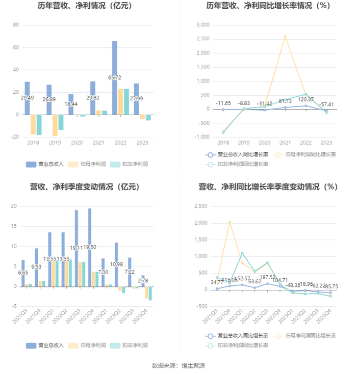 2023年,公司毛利率为4.46%,同比下降48.40个百分点;净利率为-14.04%,较上年同期下降49.45个百分点。从单季度指标来看,2023年第四季度公司毛利率为-19.98%,同比下降60.95个百分点,环比下降28.28个百分点;净利率为-109.46%,较上年同期下降128.46个百分点,较上一季度下降103.98个百分点。