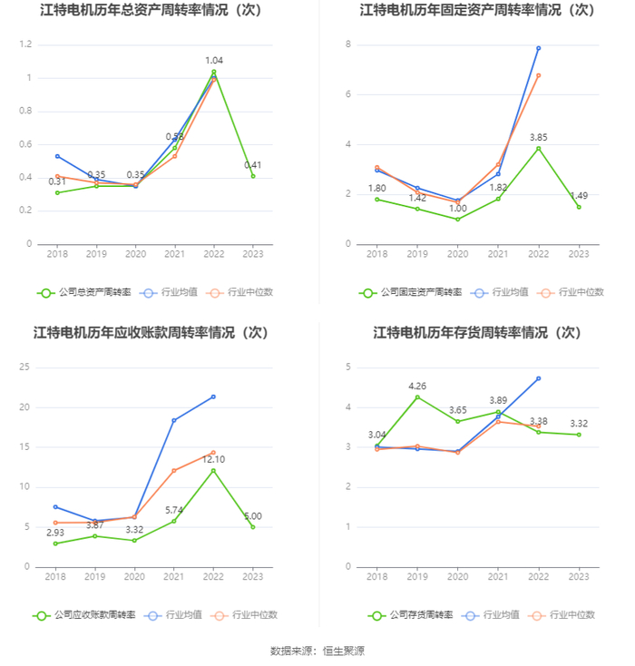 营运能力方面,2023年,公司公司总资产周转率为0.41次,上年同期为1.04次(2022年行业平均值为1.00次,公司位居同行业5/10);固定资产周转率为1.49次,上年同期为3.85次(2022年行业平均值为7.87次,公司位居同行业9/10);公司应收账款周转率、存货周转率分别为5.00次、3.32次。
