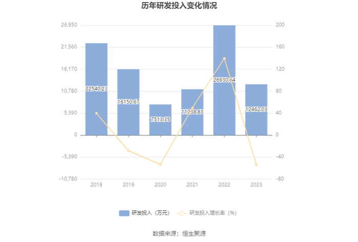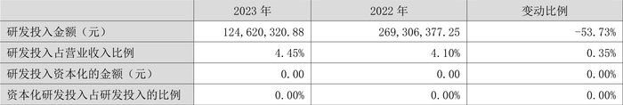 2023年全年,公司研发投入金额为1.25亿元,同比下降53.73%;研发投入占营业收入比例为4.45%,相比上年同期上升0.35个百分点。此外,公司全年研发投入资本化率为0。
