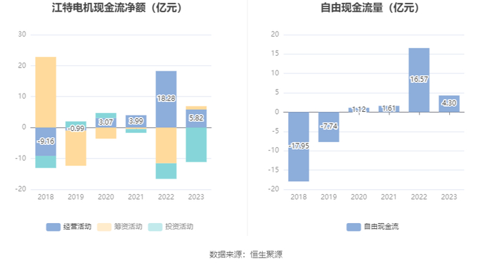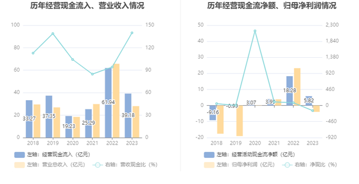 2023年,公司经营活动现金流净额为5.82亿元,同比下降68.13%;筹资活动现金流净额1.09亿元,同比增加12.65亿元;投资活动现金流净额-11.15亿元,上年同期为-5.04亿元。