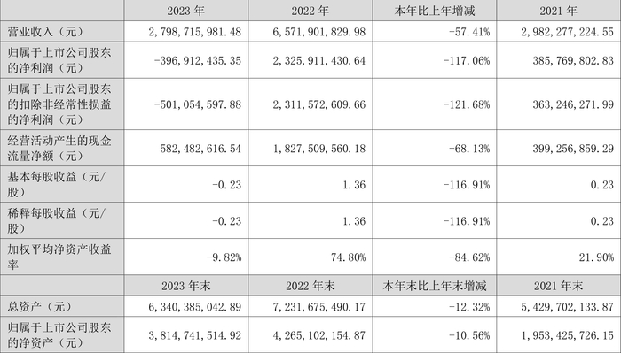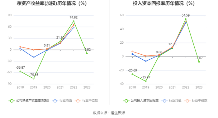 数据显示,2023年公司加权平均净资产收益率为-9.82%,较上年同期下降84.64个百分点;公司2023年投入资本回报率为-7.67%,较上年同期下降62.26个百分点。