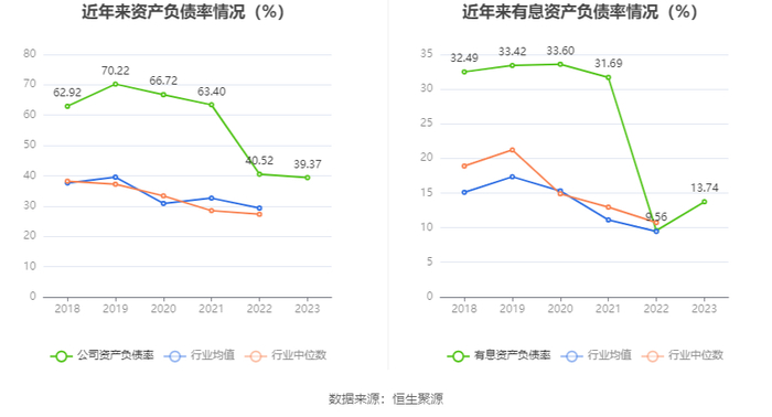 在偿债能力方面,公司2023年年末资产负债率为39.37%,相比上年末下降1.15个百分点;有息资产负债率为13.74%,相比上年末上升4.18个百分点。