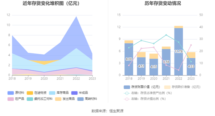 从存货变动来看,截至2023年年末,公司存货账面价值为4.33亿元,占净资产的11.36%,较上年末减少7.45亿元。其中,存货跌价准备为1.46亿元,计提比例为25.19%。