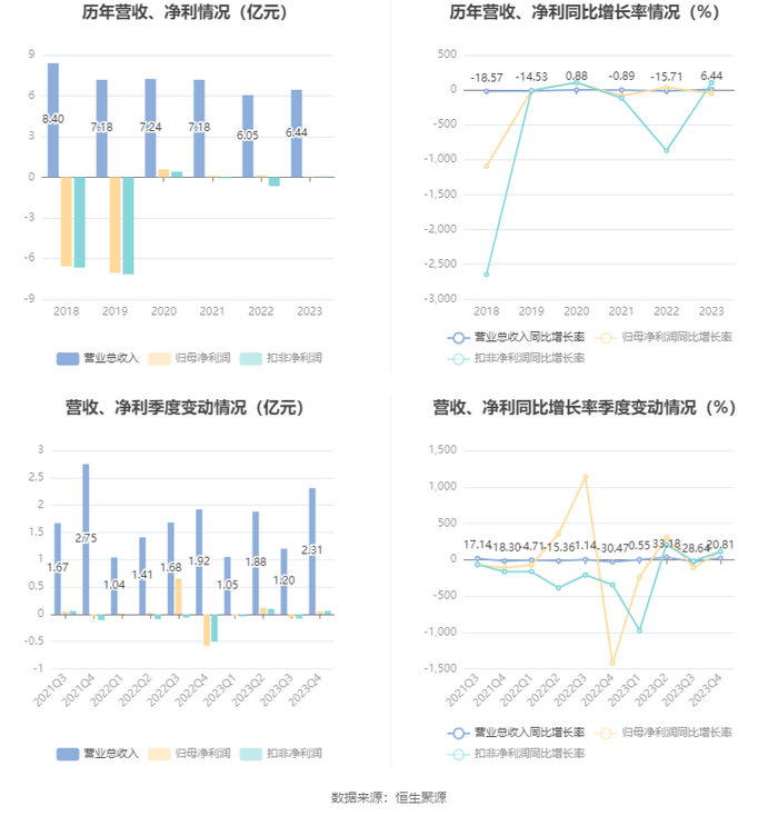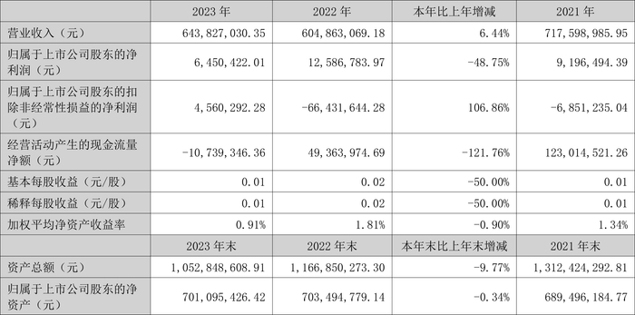 中证智能财讯 全通教育(300359)4月29日披露2023年年报。2023年,公司实现营业总收入6.44亿元,同比增长6.44%;归母净利润645.04万元,同比下降48.75%;扣非净利润456.03万元,同比扭亏;经营活动产生的现金流量净额为-1073.93万元,上年同期为4936.40万元;报告期内,全通教育基本每股收益为0.01元,加权平均净资产收益率为0.91%。