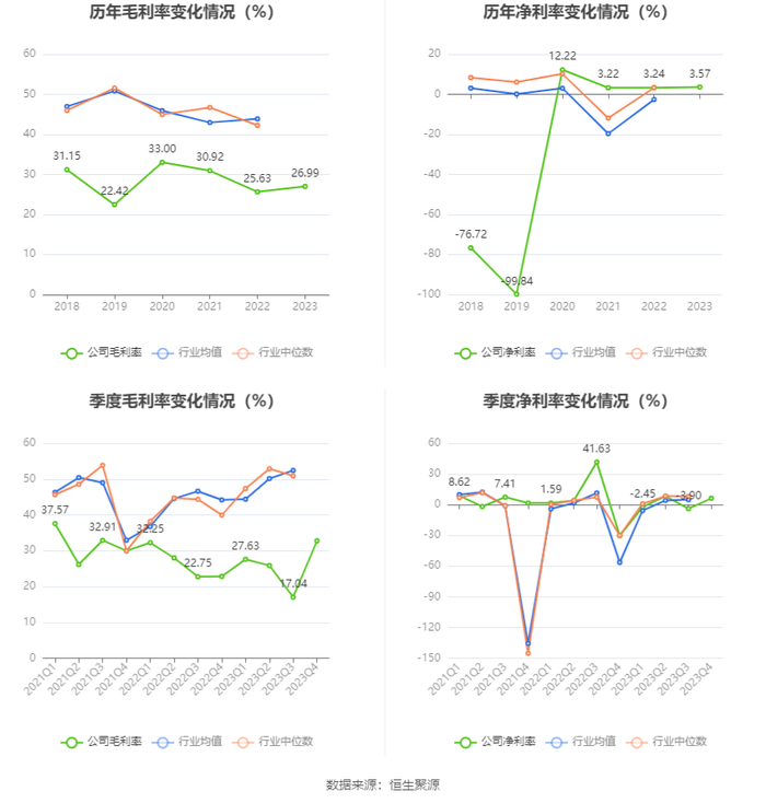 2023年,公司毛利率为26.99%,同比上升1.36个百分点;净利率为3.57%,较上年同期上升0.33个百分点。从单季度指标来看,2023年第四季度公司毛利率为32.76%,同比上升9.93个百分点,环比上升15.72个百分点;净利率为6.26%,较上年同期上升36.54个百分点,较上一季度上升10.16个百分点。