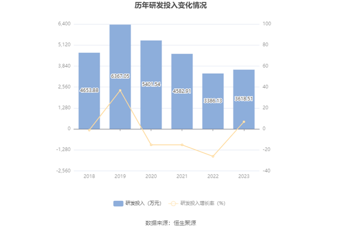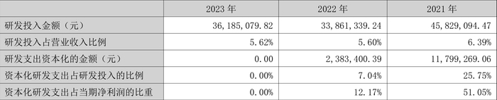 2023年全年,公司研发投入金额为3618.51万元,同比增长6.86%;研发投入占营业收入比例为5.62%,相比上年同期上升0.02个百分点。此外,公司全年研发投入资本化率为0。