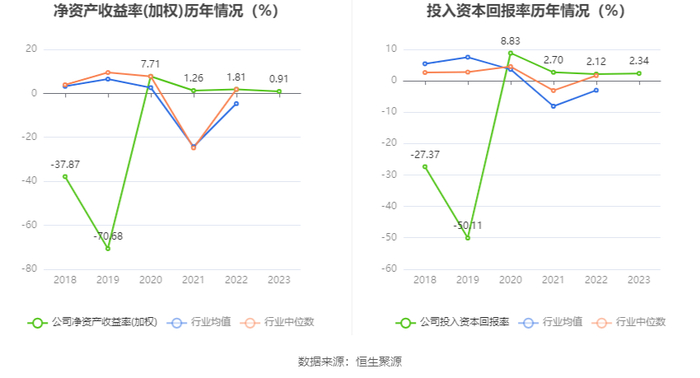 数据显示,2023年公司加权平均净资产收益率为0.91%,较上年同期下降0.90个百分点;公司2023年投入资本回报率为2.34%,较上年同期增长0.22个百分点。