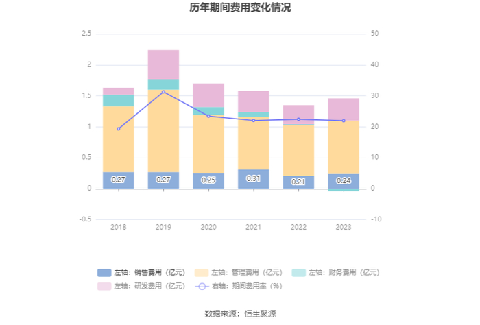 2023年,公司期间费用为1.41亿元,较上年同期增加554.33万元;但期间费用率为21.96%,较上年同期下降0.50个百分点。其中,销售费用同比增长10.87%,管理费用同比增长4.15%,研发费用同比增长14.95%,财务费用由去年同期的72.02万元变为-417.56万元。