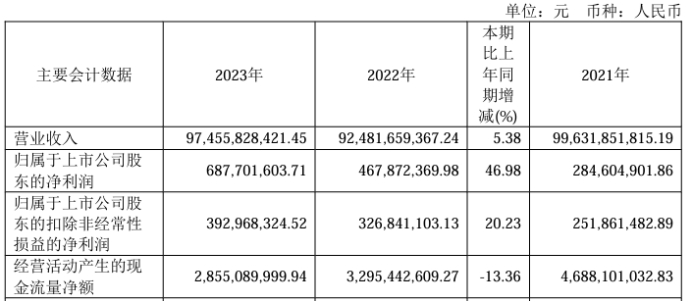 挖贝网4月28日,四川长虹(600839)近日发布2023年年度报告,报告期内公司实现营业收入97,455,828,421.45元,同比增长5.38%;归属于上市公司股东的净利润687,701,603.71元,同比增长46.98%。