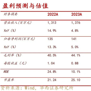 ►盈利端:毛利率提升明显,期间费用率有所上升盈利能力方面,公司2023年毛利率同比增加3.60pct至44.11%,其中Q4毛利率同比增加6.03pct至43.89%,我们预计主要系公司产品结构升级调整,高毛利产品占比提升所致。费用方面,2023年公司费用率为34.82%,同比+4.36pct;其中销售费用率为28.08%,同比+4.07pct;管理费用率为4.86%,同比+0.73pct;财务费用率为-1.23%,同比-0.49pct(主要是本期保本型现金管理业务带来的利息收益增加所致);研发费用率同比小幅+0.05pct至3.11%。净利率同比增加0.02pct至10.27%。