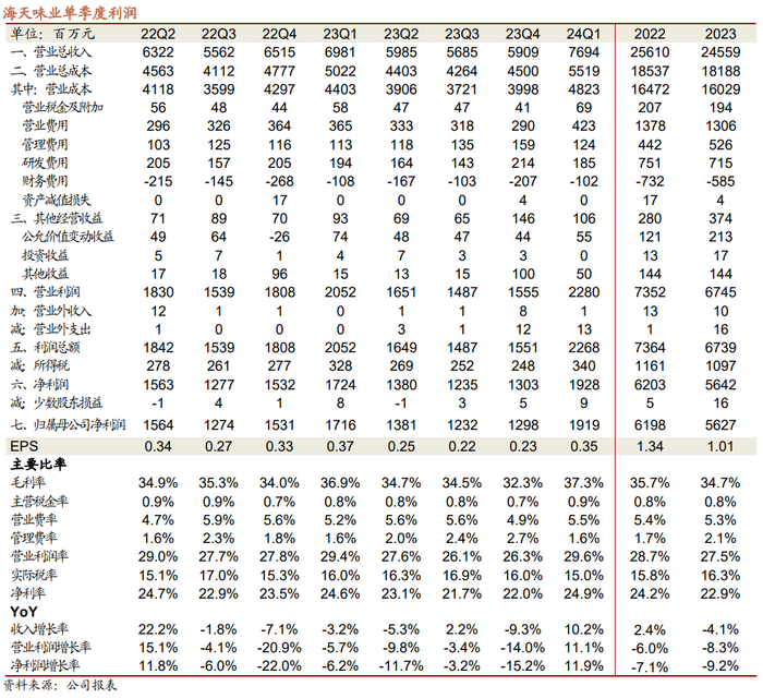 24Q1核心品类恢复增长,净利率小幅改善。24Q1公司收入同比+10.2%,其中酱油/蚝油/调味酱/其他产品分别同比+10.1%/+9.6%/+6.4%/+22.1%,东部/南部/中部/北部/西部分别同比+10.3%/+21.8%/+10.2%/+6.5%/+10.1%,大本营市场恢复更快。公司继续优化经销商结构,24Q1经销商数量合计净减少85个,东部/南部/中部/北部/西部经销商分别净变动-7/+2/-31/-49/0个。利润方面,24Q1毛利率37.3%,同比+0.4pct,销售/管理/研发费用率同比+0.3/+0.0/-0.4pct,实现归母净利率24.9%,同比+0.4pct。