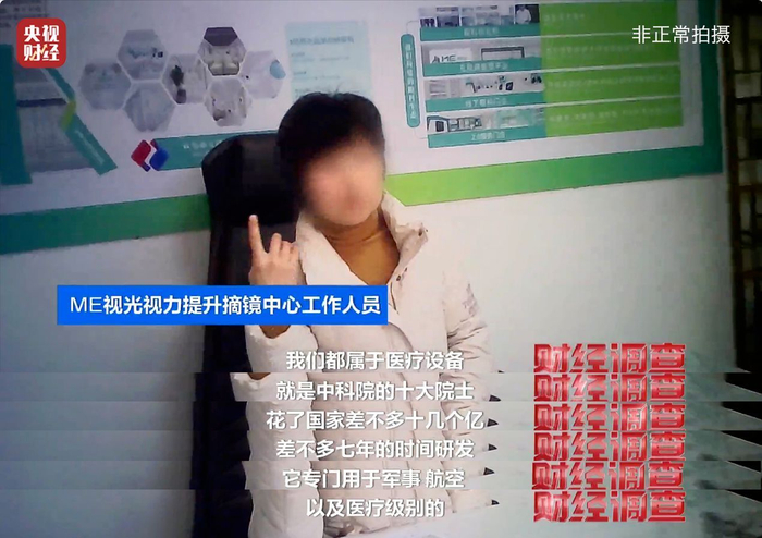 ME视光视力提升摘镜中心的工作人员还特别强调了他们机构的背景,宣称自己是医疗机构,但当记者索要这些机构相关的医疗资质证明时,工作人员却无法提供。