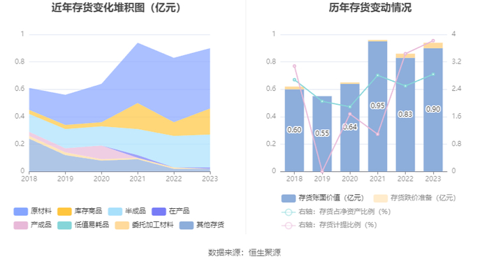 从存货变动来看,截至2023年年末,公司存货账面价值为8981.83万元,占净资产的2.84%,较上年末增加696.85万元。其中,存货跌价准备为356.4万元,计提比例为3.82%。