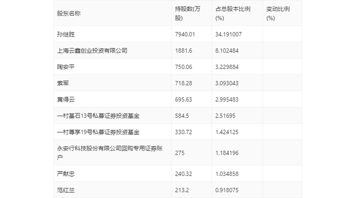 年报显示,2023年年末公司十大流通股东中,新进股东为永安行科技股份有限公司回购专用证券账户,取代了三季度末的常州远为投资中心(有限合伙)。在具体持股比例上,孙继胜、上海云鑫创业投资有限公司、索军、一村基石13号私募证券投资基金、一村尊享19号私募证券投资基金、严献忠、范红兰持股有所上升,陶安平、黄得云持股有所下降。