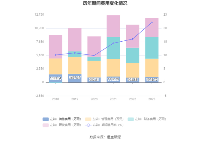 2023年,公司期间费用为1.21亿元,较上年同期增加1218.65万元;期间费用率为22.20%,较上年同期上升6.14个百分点。其中,销售费用同比增长9.62%,管理费用同比增长25.55%,研发费用同比下降18.95%,财务费用同比增长43.02%。
