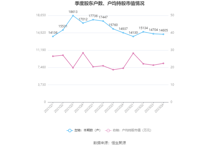 筹码集中度方面,截至2023年年末,公司股东总户数为1.46万户,较三季度末下降了99户,降幅0.67%;户均持股市值由三季度末的21.38万元上升至22.39万元,增幅为4.72%。