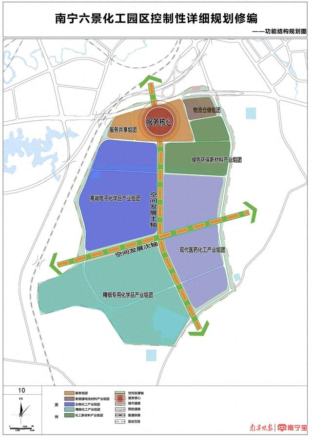 本次规划范围为G324、501乡道、化工园区10号路与化工园区4号路所围合区域,总用地面积为682.31公顷。根据规划,该工业园区功能定位为,落实东部新城“门户枢纽新城、临港产业新城、跨境物贸新城、国际翡翠新城”的总体定位,构建以电子化学品、医药精细化工和专用化学品、新型绿色环保前沿材料为核心的临港绿色化工产业体系,将六景化工园区打造成南宁市绿色化工产业集聚区。