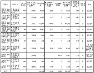 预计2024年度,石家庄常山北明科技股份有限公司(以下简称“公司”)与子公司提供担保的额度为不超过人民币33.30亿元,占2023年末公司经审计净资产的56.88%;对资产负债率高于70%的全资或控股子公司的担保额度为不超过人民币31.1亿元,占2023年末公司经审计净资产的53.12% 。本次被担保对象均为公司合并报表范围内的全资或控股子公司,不存在对合并报表范围外单位的担保。敬请广大投资者充分关注并注意投资风险。
