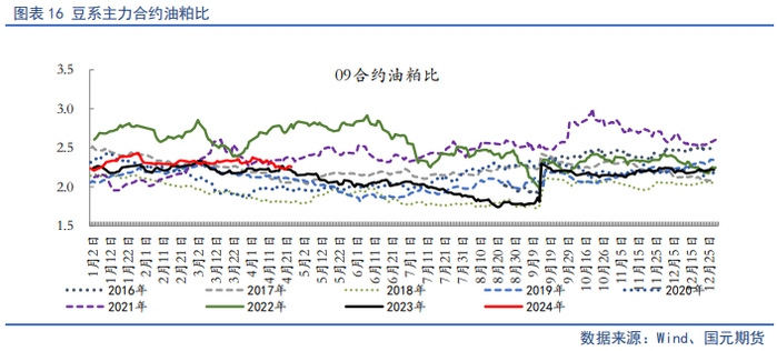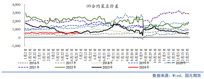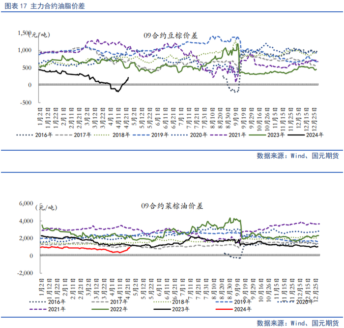 对于后市油脂单边行情,我们认为5月油脂板块将延续分化运行,但整体上方承压。棕榈油产地增产周期叠加国内棕榈油到港量增加,预计二季度国内外棕榈油将迎来库存底部拐点,供应端压力限制棕榈油上方空间。美豆进入种植期,天气忧虑开始进入交易,此前种植面积报告奠定偏空基调,重点关注5月USDA供需报告对2024/25年度全球大豆供需预期。国内5-6月国内进口大豆到港量月均1100万吨以上,处于近年历史高位,油厂压榨将迎来年内高点。二季度国内菜籽供应充足,豆、菜系供应端压力仍限制价格上方空间。