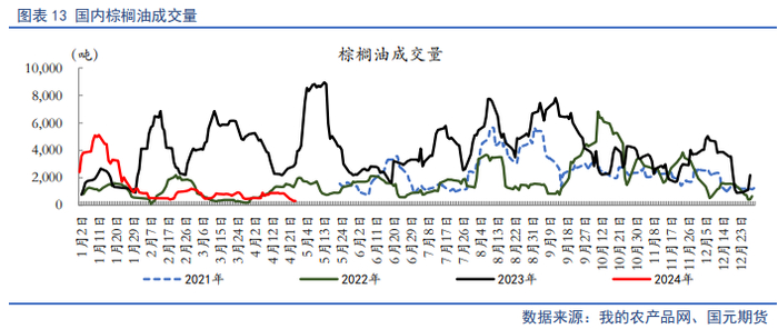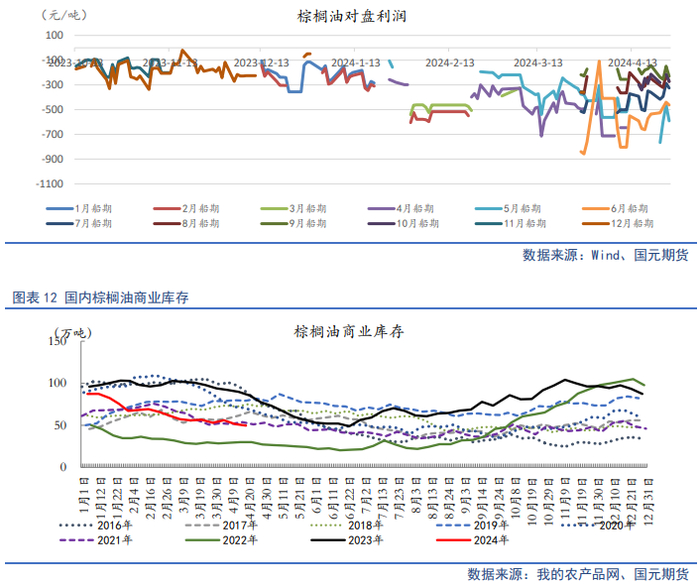 随着进口利润恢复,国内棕榈油买船增多,预计4月份24度棕榈油到港18万吨,5月22万吨,6月18万吨,加上国内棕榈油需求已经大幅压缩,预计5月份国内棕榈油库存或止降趋稳,6月份将有所回升。据Mysteel统计,截至2024年4月19日(第16周),全国重点地区棕榈油商业库存49.679万吨,环比上周减少1.82万吨,减幅3.53%;同比去年85.53万吨减少35.85万吨,减幅41.92%。