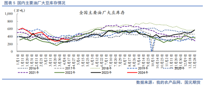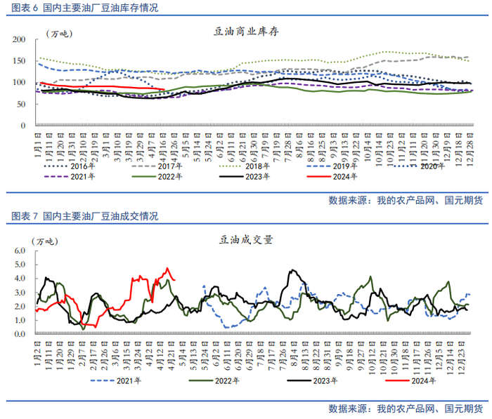 1-3月份是我国传统的油脂消费淡季,虽然春节前有备货需求,但近几年的备货节奏早已不同往日,导致1季度国内需求更加疲软,而彼时国内市场库存一直居高不下同样验证了下游补货的消极性,在供强需弱的现实情况下,豆油进口量下滑。