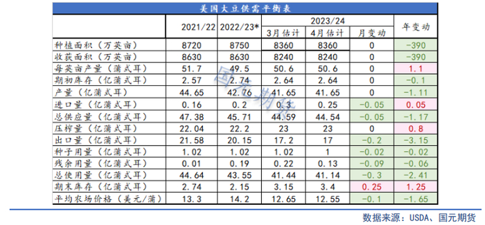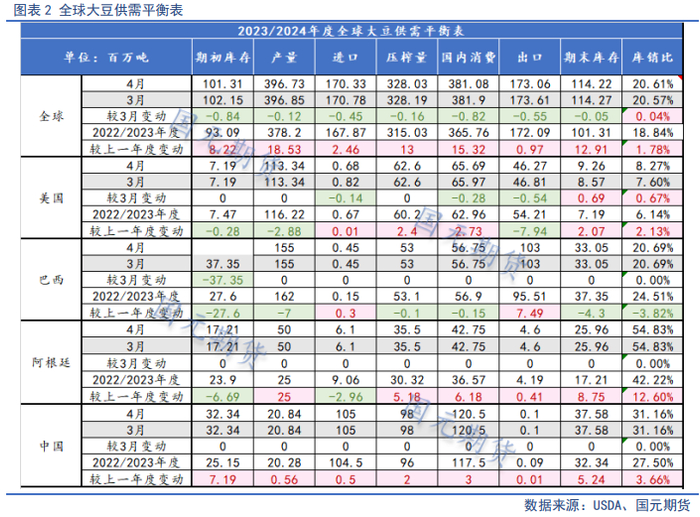 4月美农供需报告下调全球大豆产量、出口、压榨以及期末库存,供需平衡表有所收窄但幅度有限,将2023/24年度全球大豆产量略微下调12万吨或0.3%,至3.9673亿吨;全球大豆出口预期调低55万吨,至1.7306亿吨;全球大豆期末库存下调5万吨,至1.1422亿吨,但仍为5年来最高库存,此前市场预期全球大豆库存将调低170万吨。