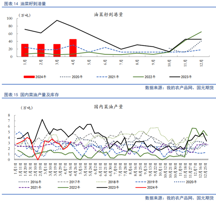 三季度前,国内菜系供应宽松格局未变。国内菜籽供应表现充足,据Mysteel调研显示,截止到2024年4月19日,沿海地区主要油厂菜籽库存为31.45吨,较上周减少8.05万吨;菜油库存为6.63万吨,较上周增加1.49万吨;未执行合同为18.78万吨,环比上周减少2.07万吨。。2024年第16周,沿海地区主要油厂菜籽压榨量为10.15万吨,本周开机率28.94%。下周沿海地区主要油厂菜籽压榨预估9.25万吨,下周开机率预估26.38%。