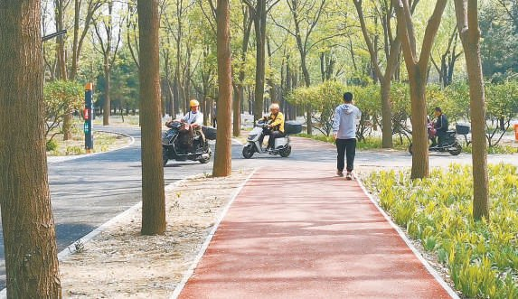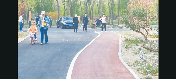 4月21日下午,记者来到东坝郊野公园探访。从西二门入园一路向东来到公园中部,不少家长正带着孩子在道路上散步、骑车。“宝贝慢点儿,瞧车!”伴随着家长的一声提醒,耳边传来电动车的鸣笛声。只见一名外卖小哥骑着电动车正快速从路上驶过。
